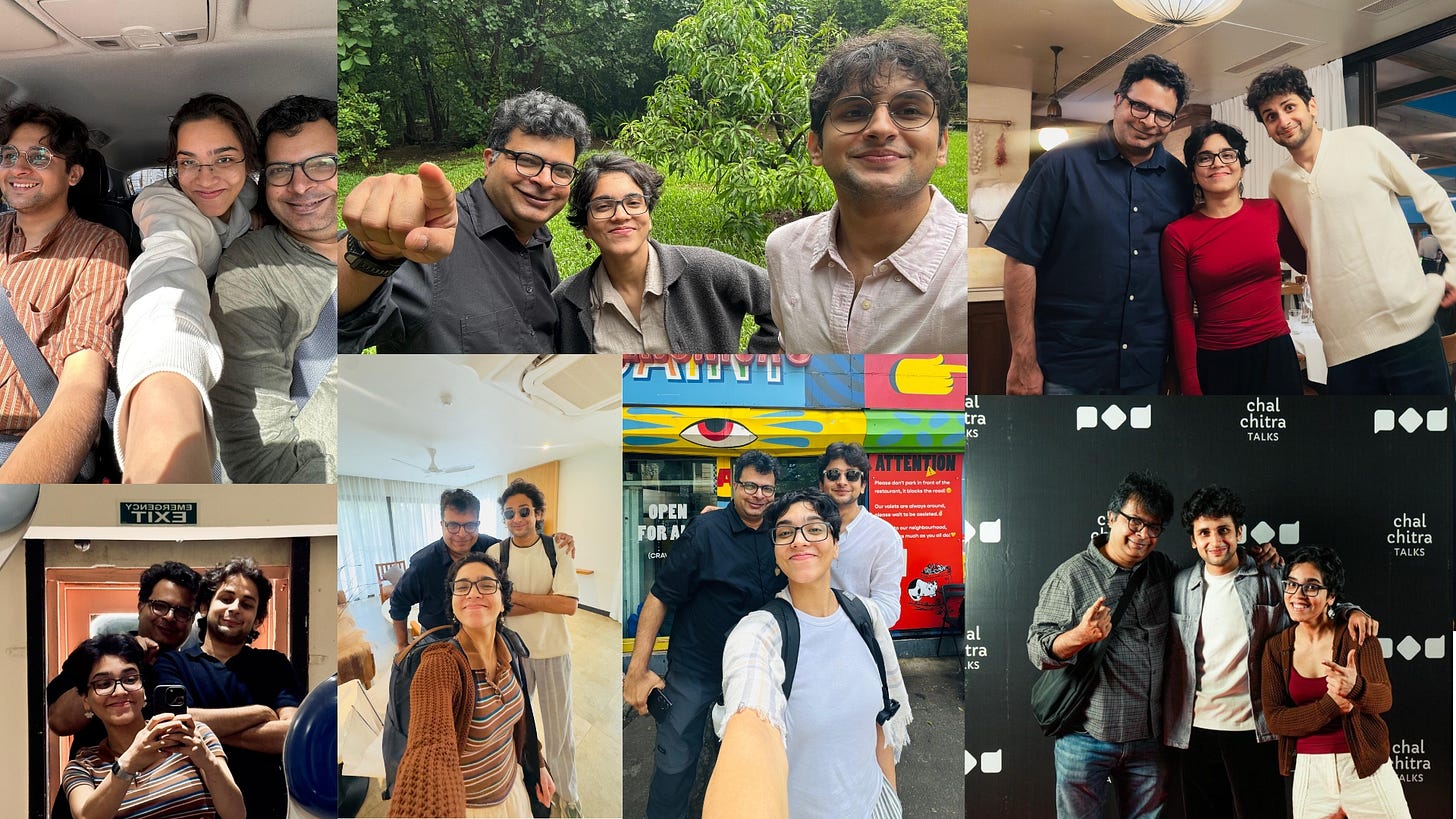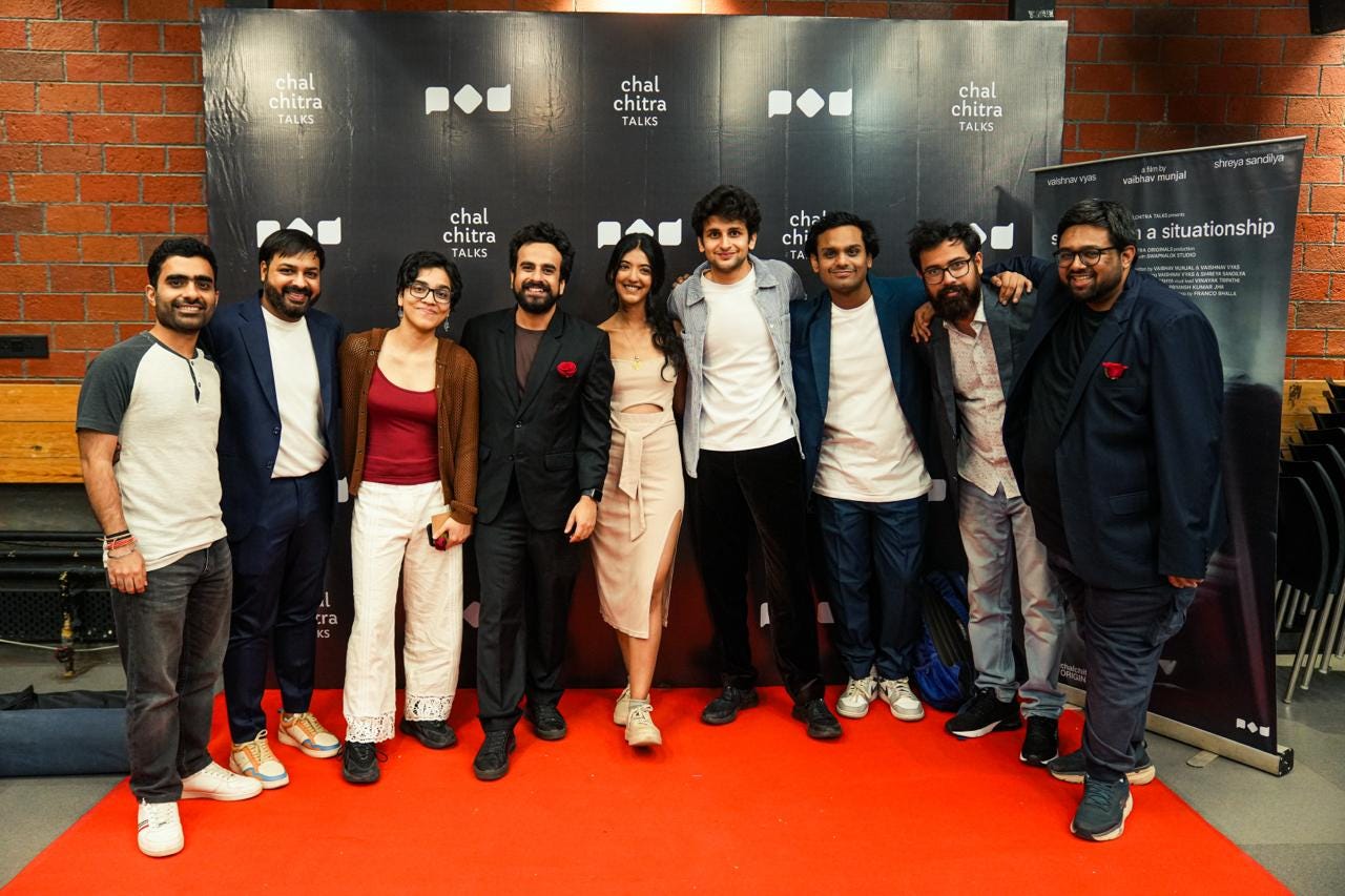 Scenes from a Situationship is directed by Vaibhav Munjal, who runs Chalchitra Talks on YouTube, and we vaguely knew each other because I’d been a guest on one of his shows a couple of times. In mid-September 2023, he spotted me in the Starbucks at Versova and came over to say hello. It struck me that I might need a new crew for this YouTube show that I had just started, so I took his number. A week later, I messaged to ask if he could recommend an editor for my show, and he recommended Nomsita. While I haven’t actually hung out with him yet, and so can’t call him a friend, I am in eternal debt to him for this.